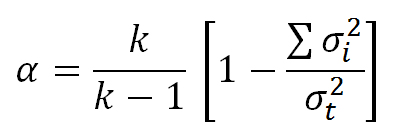 Para estimar el nivel de fiabilidad de las puntuaciones obtenidas, se calculó el coeficiente Alpha de Cronbach (α) de acuerdo con la relación descrita en Nunnally y Bernstein (1994), la que se presenta a continuación y donde k= número de ítems, representa la suma de las varianzas de los ítems y es la varianza de los totales.