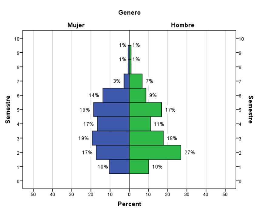 Bajo esta organización de carreras, la conformación de la muestra según el género muestra un equilibro, ya que, de los 353 estudiantes considerados, 59% fueron estudiantes varones y 41% estudiantes damas. Al revisar la proporción de hombres y mujeres a lo largo de los semestres, solo en los dos primeros semestres se tiene mayor proporción de estudiantes varones (ver figura1).