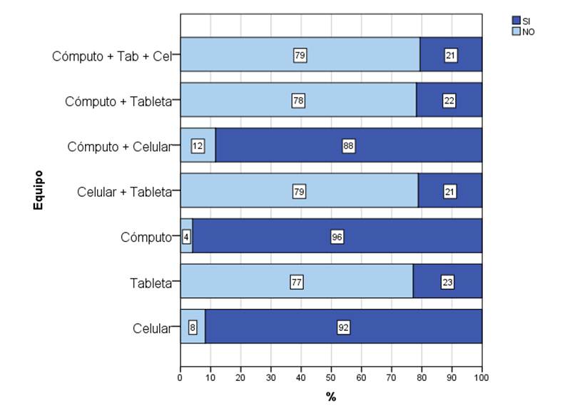 Del equipo disponible. En cuanto a la posesión de equipo, la mayoría de los estudiantes del campus cuenta con un equipo de cómputo (96%) y celular (88%). El menor porcentaje de posesión (21%) le correspondió a la tableta, en gran medida por las limitaciones de este dispositivo para el manejo de aplicaciones (software) asociados con la producción de documentos/reportes educativos. Se destaca que el estudiante universitario puede disponer de uno o más dispositivos como se muestra en los porcentajes de posesión mostrados en la figura 2.
