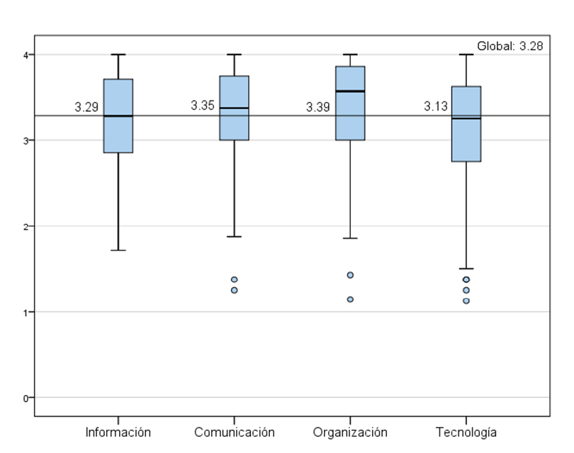 Habilidad digital. Como se mencionó en el apartado metodológico, el instrumento se organizó en cuatro dimensiones para estimar la habilidad digital del estudiante. Los valores medios obtenidos se ubicaron en el rango de 3.0-3.4, de la escala 0-4 considerada. El valor medio mayor le correspondió a la categoría de Organización, mientras que el valor medio mínimo (3.1) fue para aquellas actividades relacionadas con el manejo de la tecnología. Es de otar la cercanía entre los cuatro valores medios obtenidos, como se muestra en la figura 3.