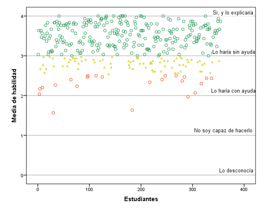 Sin embargo, si se quiere identificar aquellos estudiantes con destrezas insuficientes, será necesario ubicar al conjunto de estudiantes cuyo desempeño corresponde con los menores valores medios. Para ello, se generaron tres categorías de desempeño para la habilidad digital: i) INSUFICIENTE, para valores en el rango [0-2.5); ii) REGULAR, quienes se ubiquen entre [2.5 y 3) y iii) ACEPTABLE, para valores entre [3-4]. La figura 4 muestra el gráfico de dispersión de los valores medios de habilidad digital de los estudiantes de la muestra. Los colores seleccionados corresponden, en analogía, a los utilizados en los semáforos. Los tres grupos generados mostraron diferencias significativas (p<0.05; Anova) respecto a los valores medios de la habilidad digital.