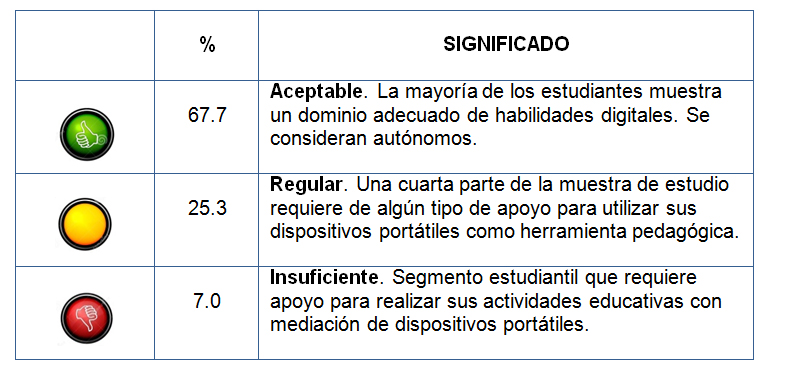 Los hallazgos mostraron que la mayoría (70%) de los estudiantes cuenta con habilidades suficientes, pero hay un segmento de esa comunidad (30%) que si requiere ayuda. Incluso, 7% de los estudiantes del estudio se ubicaron en un nivel de insuficiencia para realizar las actividades señaladas en la encuesta. Son estudiantes que, sin un apoyo dirigido, difícilmente utilizarán los dispositivos portátiles como herramienta pedagógica. Parte de la utilidad de este trabajo es precisamente identificar las destrezas problema y a los estudiantes que requieren de apoyo, utilizando para ello la metáfora de un semáforo donde a cada color se le asocia un nivel de destreza digital.