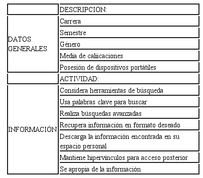 4.2 Instrumento. Se utilizó el Cuestionario sobre habilidades digitales desarrollado en el marco del proyecto de investigación mencionado. Este instrumento tuvo el propósito de determinar la posesión de equipos portátiles de los estudiantes universitarios y su nivel de habilidad digital para manejar tales dispositivos con un propósito educativo. Las destrezas de interés se ubicaron en las categorías de: acceso a información, manejo de comunicación, aspectos de organización y manejo de tecnología portátil, las cuales se reportan como las mayormente utilizadas por los estudiantes (Organista-Sandoval, Serrano-Santoyo, McAnally y Lavigne, 2013; Kukulska-Hulme y Traxler, 2007). La estructura del cuestionario se muestra en la tabla 1. El instrumento se compone de 35 reactivos, cinco para datos generales y 30 son enunciados que se dirigen a las categorías mencionadas. El nivel de habilidad se estimó con base en la escala ordinal propuesta por Carrera, Vaquero y Balsells (2011) con las siguientes opciones de respuesta: (0, Lo desconocía; 1, NO soy capaz de hacerlo; 2, SÍ, lo haría con ayuda; 3 SÍ, lo haría sin ayuda y 4, SÍ, y sabría explicar la actividad).