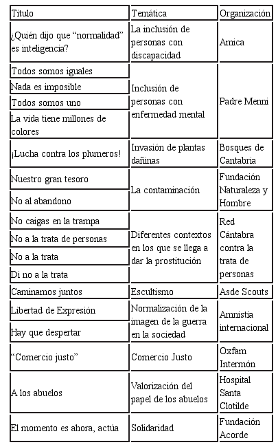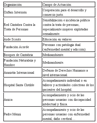 Agradecimientos: Esta experiencia no habría sido posible sin la colaboración de todas organizaciones implicadas, de la técnico responsable del área de voluntariado de la Universidad de Cantabria, Lucía Llano Martínez, y del alumnado participante. Gracias a todos.