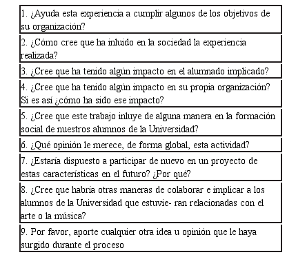 Por otra parte, con respecto a las propias organizaciones, se utilizó como instrumento la entrevista semiestructurada, la cual ha sido realizada a un miembro de cada organización tras el visiona- do de las performances. A continuación, se muestra el guión con las preguntas: