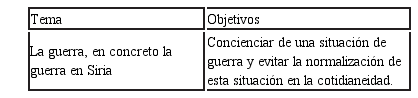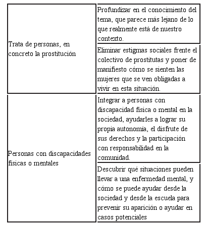 Se recogieron 18 portafolios grupales que alojaban contenidos vinculados con las organizaciones expuestas anteriormente, los objetivos que cada grupo se planteaba, las motivaciones que les habían llevado a escoger una determinada organización, los temas concretos elegidos, los procesos de elaboración de las performances y algunas reflexiones acerca de su actuación y el producto resultantes. La Tabla 3 muestra algunos de los temas abordados y los objetivos concretos de cada uno de ellos: