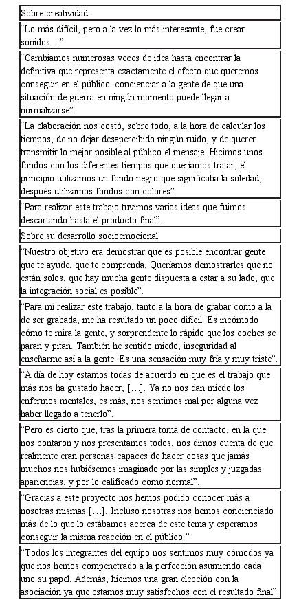 A continuación se exponen algunas de estas reflexiones recogidas en los portafolios que constituyen de algún modo, sus valoraciones sobre el proceso de trabajo y de las cuales emergen dos categorías clave: la creatividad y el desarrollo socioemocional: