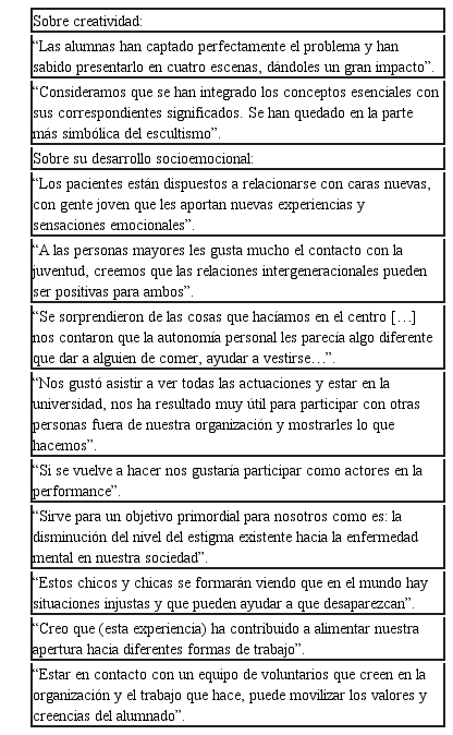 Por el contrario, aquellas organizaciones que han participado como público en alguna de las interpretaciones en vivo manifiestan que esta experiencia contribuye a lograr una mayor visibilidad tanto de determinadas problemáticas sociales, como de las actuaciones que frente a ellas llevan a cabo estas instituciones. Las entidades que cuentan con personas usuarias han valorado dos aspectos de esta colaboración. En primer lugar, la oportunidad que esta experiencia supone para sus usuarios de acercarse a la universidad, contexto que de forma habitual les resulta de difícil acceso. En segundo lugar, resaltan la validez del intercambio emocional y social que ha tenido lugar entre los estudiantes y las personas usuarias.