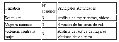 De forma paralela, se desarrolló el segundo eje, donde se profundizó la temática de género con un enfoque desde lo femenino. Este eje estuvo enmarcado entre los meses de agosto y noviembre del 2015 con 8 sesiones en total, teniendo la misma duración de sesión que el eje descrito anteriormente. De este modo, se hizo una revisión histórica del rol de la mujer y se analizó su protagonismo en la actualidad. Se promovió el cuestionamiento y la reflexión mediante la exposición de mujeres íconos de la historia y se hicieron analogías con la realidad que viven las jóvenes en su cotidianidad. Al igual que el primer eje, la modalidad de trabajo fue principalmente experiencial, recogiendo las vivencias de las estudiantes por medio de sus relatos y uso de diversos dispositivos como power point, videos, textos, entre otros.