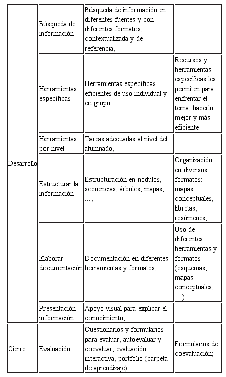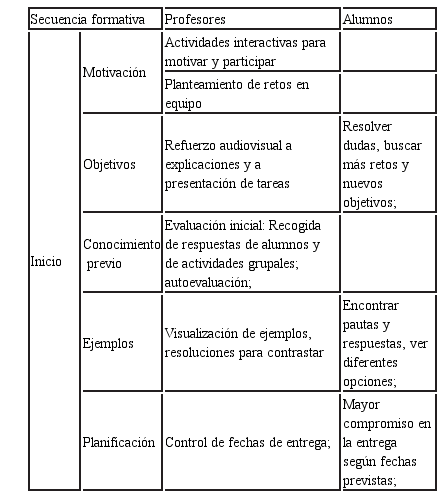 A partir del análisis de las encuestas a profesores y alumnos y de los grupos focales respectivos se han extraído los ámbitos de apoyo de las TIC para el desarrollo de la CdAaA. Los datos se presentan estructurados según las fases de la secuencia formativa del proceso de enseñanza aprendizaje (inicio, desarrollo y cierre) (Giné, Parcerisa, Llena, Paris y Quinquer, 2003) diferenciando entre la opinión de profesores y alumnos.