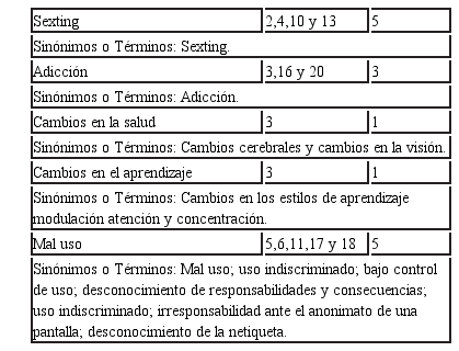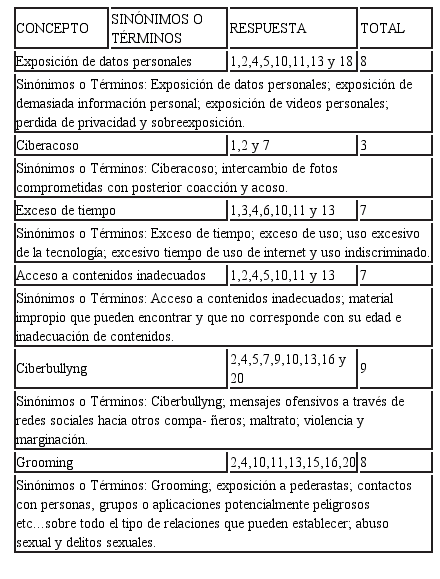 En la pregunta abierta: ¿Enumere los factores de riesgo de las TICs para menores?, al realizar el análisis de resultados en un primer momento se agruparon las respuestas que los participantes emplearon para responder cuales son los factores de riesgo que perciben, a partir de ahí, se detectó que algunas respuestas empleadas por cada participante eran términos equivalentes respecto a las respuestas de otros participantes, por lo que se procedió a etiquetarlas como términos equivalentes y a hacer un conteo de la frecuencia de aparición de cada respuesta en el total de las respuestas, para detectar los conceptos con más frecuencia. Esto se ilustra en la tabla 8 y 9: