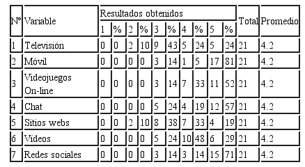 4.1.4 Valore los siguientes medios en los jóvenes y menores: televisión, móvil, videojuegos online, chat, sitios webs, videos y redes sociales.