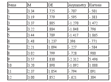 The descriptive analysis of the items, as shown in table 1, raises a range of responses in general, within the appropriate parameters in terms of distribution with values of asymmetry and kurtosis between 2 and 2 which is expected for a distribution normal according to Bollen and Long (cited in Núñez-Alonso, Martín-Albo and Navarro, 2007).