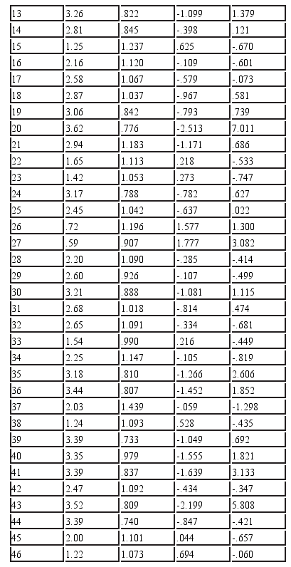 Only in three of the items (items 9, 20 and 43) were inhomogeneous distributions with high values of asymmetry and kurtosis and two with high values only in kurtosis but not in asymmetry (items 27 and 35). These items were reviewed and corrected in their wording.