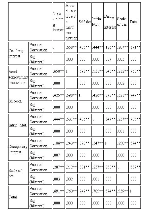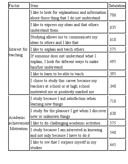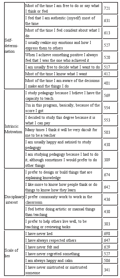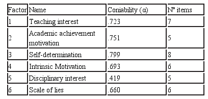 The Kayser index, raised the possible existence of 9 factors. However, it was decided to limit them to 6 in order to agree with the criteria shown by the literature. The total variance explained by the 6 factors is 42.40%. The factors were named according to the conceptual characteristics gathered in the literature review and according to the orientation that the groupings of items in the factors showed. These are: Interest for teaching, motivation of academic achievement, self-determination, intrinsic motivation, disciplinary interest, and a scale of lies.