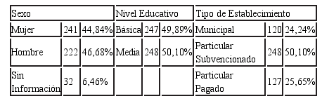 La muestra está constituida por 495 estudiantes desde quinto año de enseñanza básica hasta cuarto año de Enseñanza Media, de los cuales un 44,84% son hombres, un 48,68% son mujeres y un 6,46% sin información.