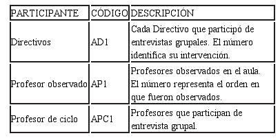 Finalmente, se realizó en cada establecimiento una entrevista grupal, donde participaron los docentes del ciclo observado (enseñanza básica) los docentes observados en aula y los docentes directivos. Se socializaron en esta entrevista los resultados preliminares de la observación de clases. Fue necesario asignar un código a los participantes de la investigación. A continuación, se presenta esta codificación, como se indica: