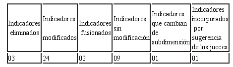 Cada juez recibió una carta que describía en términos generales la investigación, su contexto y objetivos. Para asegurar la comprensión de los jueces se registró gráficamente un ejemplo de cómo responder el instrumento. Finalmente, se agregó una ficha donde se solicitó al juez registrar sus datos y su firma. Se solicitó a los jueces valorar el instrumento considerando tres criterios: pertinencia, univocidad e importancia. Además, previamente al envío de los instrumentos se establecieron los criterios para la eliminación o modificación de los indicadores del instrumento. El resultado de la validación se observa en la tabla 2.
