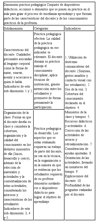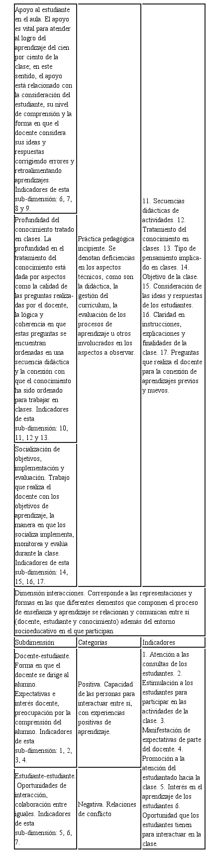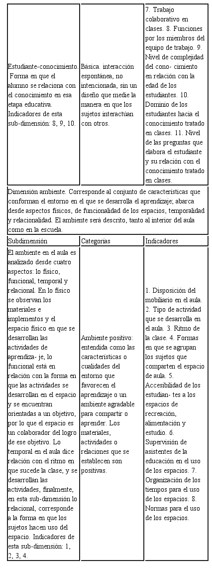 Luego de la validación, la pauta de observación queda finalmente con 36 indicadores. Por su extensión este instrumento desarrollado en una rúbrica no se presenta en este artículo, sólo su estructura básica que se muestra a continuación en la tabla 3, donde se recogen las dimensiones, subdimensiones, categorías y sus indicadores.