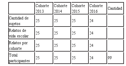 Los participantes del estudio fueron 99 (tabla 1) estudiantes de las cohortes 2013, 2014, 2015, 2016 de la carrera de Educación General Básica de la Universidad de Concepción, Concepción, Chile.