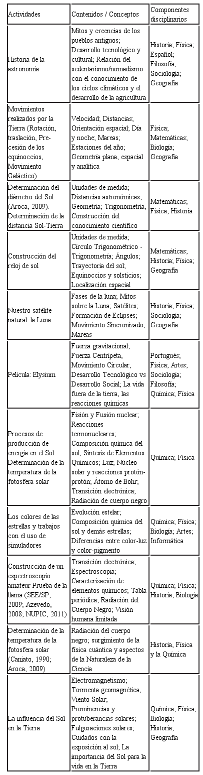 El Sol se configuró como pilar que sostuvo todas las acciones de la investigación, siendo el responsable de orientar las acciones contextualizadas e interdisciplinarias desarrolladas con los alumnos. En este último aspecto, las siguientes actividades (algunas de estas experimentales utilizando materiales de bajo costo) se integraron a las SEA (Tabla 1). Se resalta que tales actividades han sido trabajadas en otras investigaciones en escenario brasileño con éxito, por ejemplo en el trabajo desarrollado por Colombo (2014), que buscó la relación entre la educación formal y no formal colocando énfasis en la Física Solar. En la presente investigación el foco se centra sólo en la educación formal.