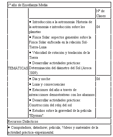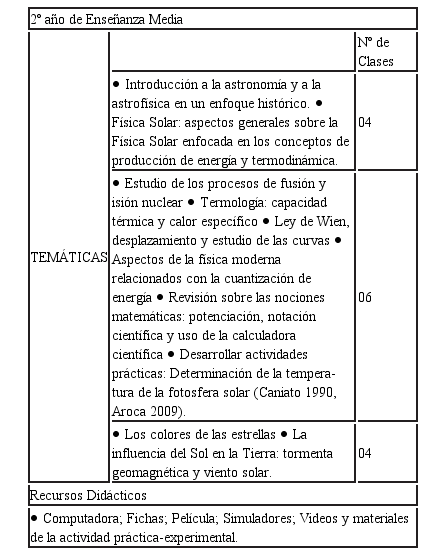 La SEA orientada al 2º año de la Enseñanza Media fue desarrollada en un total de 14 clases, en dos grupos. El profesor inició las actividades enfocando estas temáticas por medio de un abordaje histórico y ampliando su estudio a través del estudio de los aspectos generales sobre la Física Solar, teniendo en cuenta que los alumnos aún no habían estudiado tópicos de Astronomía y Astrofísica. Los temas curriculares abordados fueron: concepto de calor, capacidad térmica y calor específico, procesos de cambio de calor, efecto invernadero, radiaciones electromagnéticas, propagación y características de la luz y astronomía. Frente a los enfoques realizados, se empleó una película, simuladores, videos y materiales de la actividad práctica-experimental (Tabla 3).
