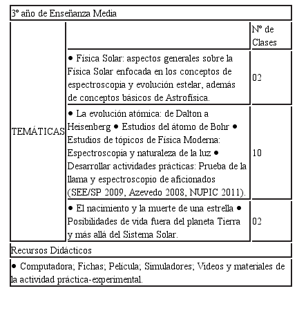 La SEA orientada al 3º año de la Educación Secundaria fue desarrollada en un total de 14 clases, en dos grupos. El profesor inició las actividades enfocando estas temáticas por medio de un abordaje histórico y ampliando su estudio a través del estudio de los aspectos generales de la Física Solar, teniendo en cuenta que los alumnos aún no habían estudiado tópicos de Astronomía y Astrofísica. Los temas curriculares abordados fueron: conceptos de física cuántica, átomo de Bohr, fusión y fisión nuclear, magnetismo. Frente a los enfoques realizados, también se empleó una película, simuladores, videos y materiales de la actividad práctica-experimental (Tabla 4).