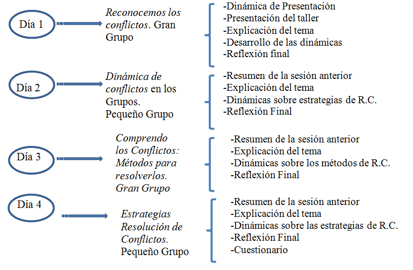 La experiencia comienza con el desarrollo de un registro de observación de las carencias del alumnado universitario a la hora de trabajar en equipo, en habilidades tales como aprendizaje autónomo, interacción social, escucha activa, etc. De esta manera detectamos un grupo clase que necesita formación en habilidades de trabajo en equipo para el desarrollo de sus prácticas y futuro profesional, y otro grupo de alumnos/as que reconocen carecer de estrategias de resolución de conflictos que les genera situaciones disruptivas en el aula. A partir de aquí, se decide elaborar, implementar y evaluar un taller sobre resolución de conflictos al alumnado del grado de educación primaria, donde los formadores fuesen el alumnado del grado de educación social.