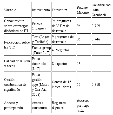 Se elaboraron los instrumentos, menos en gestión colaborativa de significados, en la que se usó una pauta diseñada por Mauri y Onrubia (2008, citado en Coll, et al., 2011), todos con un adecuado nivel de confiabilidad.