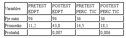 Las evaluaciones de pre y postest se hicieron respecto a las variables dependientes: Conocimiento sobre las estrategias de producción de texto, percepción sobre las TIC, calidad del producto wiki, acceso y participación en foro y wiki, gestión colaborativa de significados.