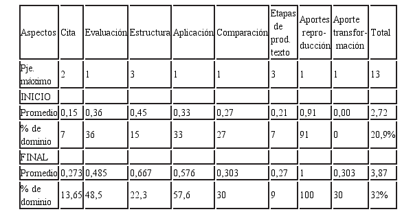 Los aspectos menos desarrollados en la wiki fueron el aporte como transformación del conocimiento, con un dominio de 10% y presente solo en 10 estudiantes; en estructura o inclusión de las etapas de producción de texto. La distribución de estructura de los textos, a través de las aportaciones o contribuciones de cada participante tendía a no marcar un claro inicio, desarrollo y conclusión, sólo un 30% de los participantes lo marcan en forma implícita, especialmente inicio y desarrollo. Ningún grupo concluyó en forma adecuada, es decir, que se desprendiera del desarrollo, lograron un dominio de 22,3%; presente y observable en 18 estudiantes; las citas o inclusión de referencia bibliográficas, con un dominio de 13,65% de un máximo de 2 puntos, y que se observó en 10 estudiantes; la comparación de estrategias didácticas, con un dominio de 10%, presente en 10 estudiantes. El menor dominio estuvo en las etapas de producción de texto, planificar, escribir y revisar, con 9% y evidenciado en 9 estudiantes.