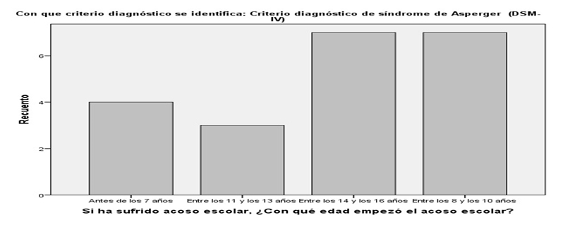 En relación a la edad de inicio del acoso escolar es significativo como entre el alumnado con TEA esta es muy similar en todos los espectro de edad, se aprecia que entre los 8-10 años (26.9%), entre los 11-13 años (26.9) y entre los 14-16 (26.9%) los valores son los mismos, pues encontramos a 7 sujetos en cada uno de los espectros de edad. En relación al alumnado menor de 7 años encontramos que componen el 19.2% de los sujetos participantes (7), no encontrándose inicio de acoso escolar a partir de los 17 años. En el alumnado con TEA nivel 1 (síndrome de Asperger) encontramos que se produce mayor acoso escolar entre alumnado con edades comprendidas entre los 8-10 años y los 14-16 años tal y como demuestra el gráfico.