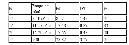 En cuanto a la edad media de los participantes por rango de edad encontramos que han participado 12 personas con edades comprendidas entre los 5-10 años, lo que corresponde al 24% de la muestra, 16 personas (32%) en el rango entre los 11-15 años, 10 personas (20%) en el rango 16-20 años, y 12 personas (24%) con más de 20 años, la muestra ha estado compuesta por sujetos que se encuentran en un rango de edad que oscila entre los 5 y los 34 años.