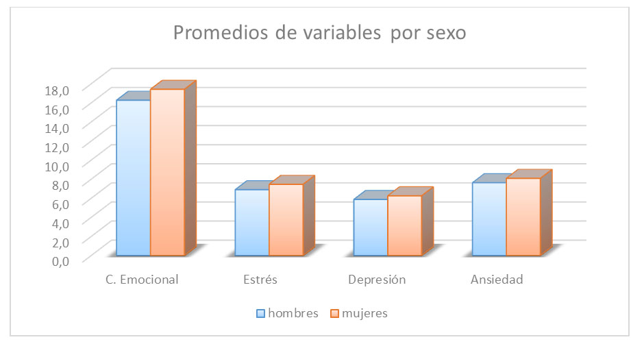 En otra línea, caracterizando en forma más específica más este desarrollo de factores de desarrollo emocional, podemos señalar que, a nivel de sexo, los hombres presentan menor conciencia emocional que las mujeres (Mhombre=16.28, DE=5.1; Mmujer=17.51, DE=5.35), menor estrés (Mhombre= 6.9, DE= 4.77, Mmujer= 7.46, DE= 5.1) menores indicadores de depresión (Mhombre= 5.86, DE=4.7, Mmujer=6.27, DE=4.8) y menor ansiedad (Mhombre=7.62, DE=5.7, Mmujer=8.1, DE=5.9). Se logra observar asimismo que estas diferencias son estadísticamente significativas solo respecto a la conciencia emocional (t=4.14, p=.000) y al estrés (t=1.99, p=.047) en donde este último factor podría ser solo una diferencia tendencial.