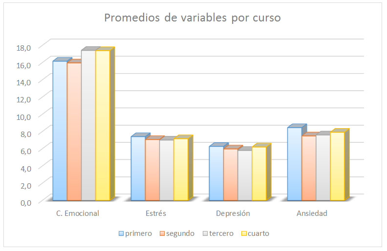 Además se observa respecto al nivel educativo que en primer año los puntajes de las variables se encuentran medianamente homogéneas (Mprimero=16.17, DE=4.9; Msegundo=15.96, DE=5.2; Mtercero=17.43, DE=5.2; Mcuarto=17.4, DE=4.9), en estrés hay homogeneidad en puntajes (Mprimero= 7.41, DE=4.9; Msegundo= 7.07, DE=4.4; Mtercero=7.01, DE=5.1; Mcuarto=7.17, DE= 5.1), en depresión los puntajes son medianamente homogéneos (Mprimero= 6.27, DE=4.9; Msegundo= 5.98, DE=4.3; Mtercero= 5.81, DE=4.5; Mcuarto=6.18, DE= 5.1); finalmente se observa que en ansiedad los puntajes son medianamente homogéneos (Mprimero=8.45, DE=6.2; Msegundo= 7.49, DE=5.1; Mtercero=7.60, DE=5.8; Mcuarto=7.9, DE= 6.1). En esta faceta solo se encontraron diferencias significativas en conciencia emocional (F= 7.41, p< .05), con diferencias en los niveles de primero y segundo medio, respecto de los de tercero y cuarto medio, teniendo estos últimos un mayor desarrollo de la conciencia emocional.