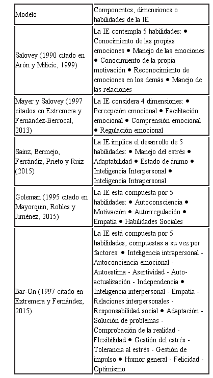 La Inteligencia Emocional ha sido definida en términos conceptuales y, además, se han construido diversos modelos para describir sus componentes y habilidades (Tabla 1).