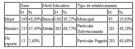 La muestra está constituida por 499 estudiantes desde quinto año básico (10 años de edad) hasta cuarto año de enseñanza meda (17 años de edad) de la Provincia de Concepción, específicamente de las comunas de Concepción, Talcahuano y Chiguayante.