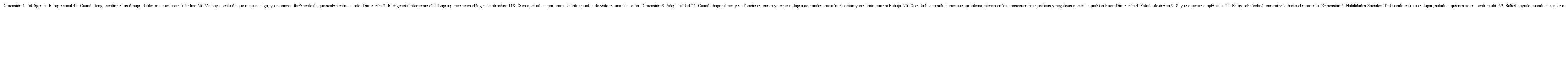 • Dimensión 1: Inteligencia Intrapersonal, compuesta por 54 ítems distribuidos en 6 factores que componen la dimensión, los cuales son Consciencia Emocional, Regulación Emocional, Autoestima, Conocimiento de las propias motivaciones, Asertividad e Independencia.