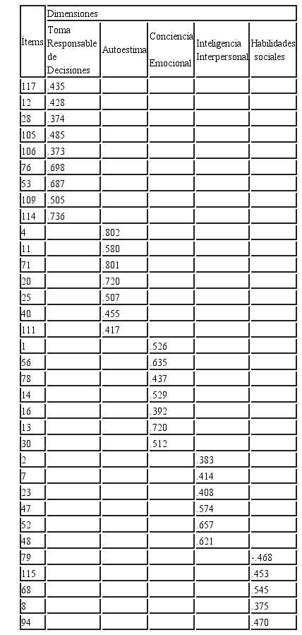 • Dimensión 5: Habilidades sociales, compuesta por 24 ítems distribuidos en cuatro factores que componen la dimensión, los cuales son Pensamiento consecuencial, Habilidades conductuales para ajustarse socialmente, Comprensión de causalidad emocional y Toma responsable de decisiones.