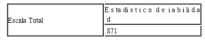 Al analizar la confiabilidad del instrumento piloto en su versión final, se obtuvo un Alfa de Cronbach de .871, lo cual da cuenta de adecuadas propiedades psicométricas como instrumento de medición.