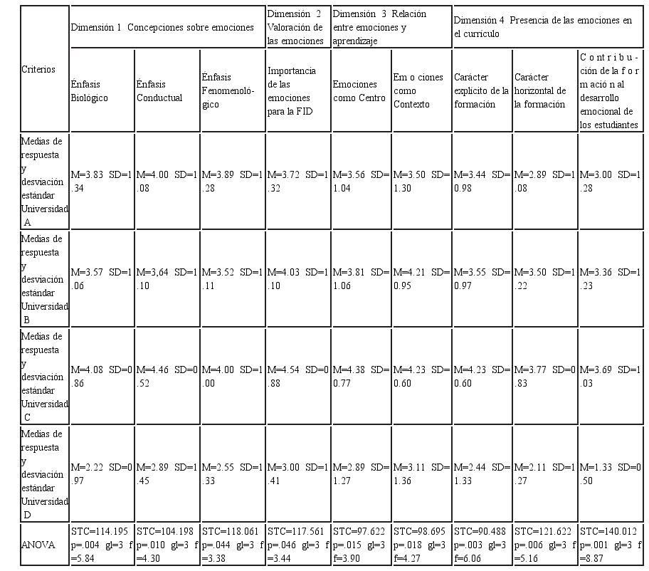 El análisis documental consistió, en primer lugar, en la identificación de aquellos criterios de evaluación que permitían detectar diferencias entre universidades para lo cual se realizó un análisis de su varianza (ANOVA de un factor). Posteriormente, considerando el comportamiento del conjunto de dichos criterios en cada universidad, se hizo una interpretación de los mismos en términos de perfiles de consideración de las emociones en el componente explicito de la FEID.