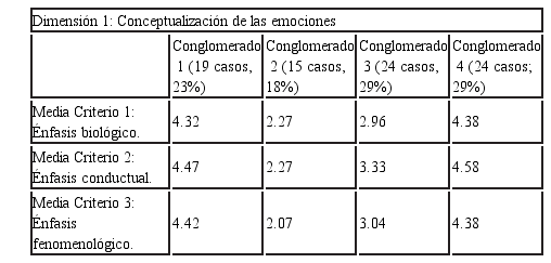 Considerando estos resultados bajo la misma lógica aplicada a los otros niveles de la evaluación, pueden describirse cuatro perfiles que muestran diferentes formas de considerar las emociones en lo que respecta al componente explícito de la FEID.