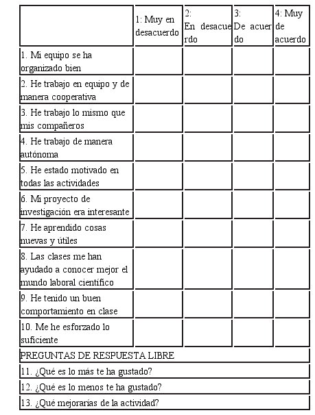 Las encuestas realizadas a los alumnos consistían en 10 preguntas en las que los encuestados debían reflexionar sobre su rendimiento y motivación, la utilidad de las actividades realizadas, la autonomía y organización del grupo de trabajo. Se debían contestar utilizando una escala de tipo Linker del 1 al 4 donde 1 corresponde con “estoy muy en desacuerdo” y el 4 con “estoy muy de acuerdo”. Además, las encuestas presentaban 3 preguntas de respuesta libre donde los alumnos debían describir los puntos fuertes y débiles de las actividades y proponer cambios de mejora (tabla 4).