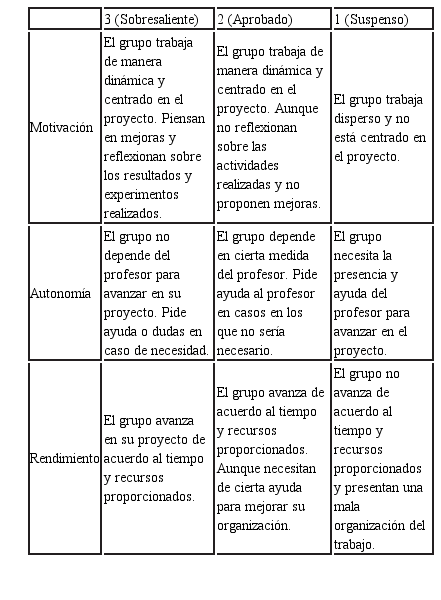 En último lugar, los apuntes y anotaciones realizados por el profesor de la asignatura estaban relacionados con el rendimiento y comportamiento de los alumnos en clase. Gracias a estas anotaciones y las encuestas de opinión de los alumnos se pudo evaluar la motivación del alumnado, su trabajo en equipo y su autonomía. Las anotaciones consistían en apuntes del profesor sobre la motivación y actitud de cada uno de los alumnos y evaluación de rendimiento y autonomía mediante la utilización de una rúbrica personal a modo de guía (tabla 5).