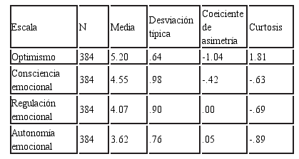 Según la información arrojada, se tiene que las escalas de optimismo y consciencia emocional ocupan el lugar de mayor dominio en los docentes y, la que menos, es la autonomía emocional. Destaca, además, que la desviación típica o estándar es mayor en las escalas de consciencia y regulación emocional –otras dos denominadas habilidades intrapersonales-. Esto muestra una polarización en las respuestas y significa que hay más disparidad en la percepción que tienen los docentes sobre esta habilidad propia; es decir, quienes se consideran competentes y otros que no en dichos rubros.