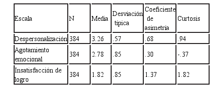 Según los datos expuestos, la escala de optimismo es la que muestra los valores más elevados, al tanto que la autonomía emocional posee una ponderación menor, debido, probablemente, a la estabilidad laboral que poseen los docentes que, en su mayoría, participan en el sector público, que se releja en la primera subescala citada; por otra parte, se destaca la baja autonomía emocional que puede desencadenar comportamientos dependientes de agentes o personas ajenos al propio profesor; ambos resultados se discuten con mayor profundidad. Enseguida se presenta el análisis descriptivo de las escalas conformantes del burnout (Tabla 2).