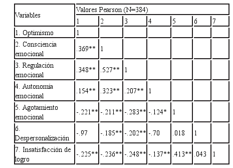 De acuerdo con la anterior matriz, se observa que la muestra analizada refiere poseer una sensación de logro positiva, lo que se traduce en una regular conformidad en la realización de su labor; por otra parte, la despersonalización también evidencia un valor elevado, lo que implica la posibilidad de la presencia de conductas cínicas o indolentes hacia los estudiantes, además, hacia los compañeros de trabajo y demás actores de la comunidad educativa. A continuación, se presenta el análisis correlacional de las escalas que conforman las habilidades emocionales y burnout (Tabla 3).