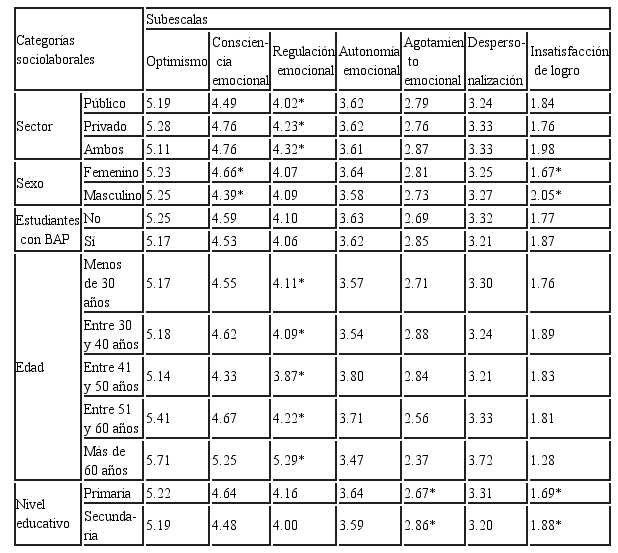 Según los resultados, se observan diferencias significativas en las escalas de consciencia emocional según el sexo (t=2.68, p=.008); regulación emocional por sector donde laboran los docentes (F=2.93, p=.033) y por la edad (F=2.47, p=.032); el agotamiento emocional presenta diferencias significativas de acuerdo con el nivel educativo (t=-2.11, p=.035); finalmente, la insatisfacción de logro muestra diferencias en las variables de sexo (t=-4.04, p=.000) y nivel educativo (t=-2.23, p=.026). Los resultados referidos ponen, en general, de manifiesto lo señalado por Torres (2018) al declarar que las mujeres poseen mayor habilidad para reconocer y manejar sus emociones, aunque son más propensas para padecer agotamiento; por otra parte, los varones se muestran más insatisfechos con su labor, quizá debido a las condiciones de educación para la competitividad que hayan recibido como formación familiar o cultural. Asimismo, destaca el mayor agotamiento emocional a nivel secundaria.