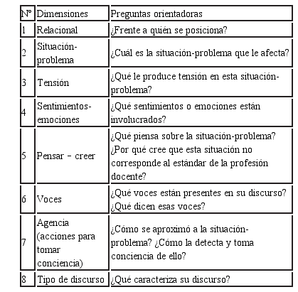 Una vez organizadas las dimensiones y categorías comenzaron a surgir las posiciones del Yo, las que están expresadas en frases que inician con la palabra Yo, tales como: Yo como ético; Yo como práctico; Yo decepcionado; Yo como empático; Yo buscando validación; Yo dialogando.