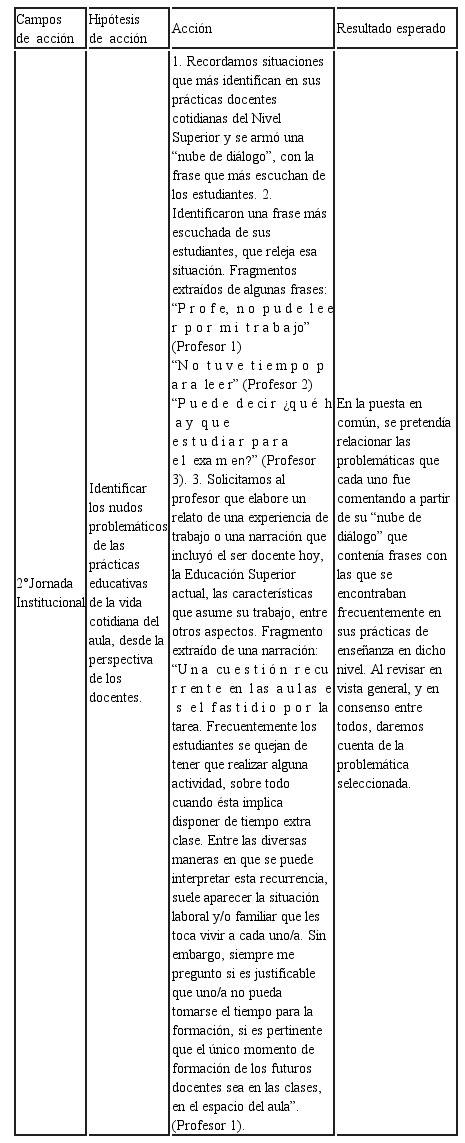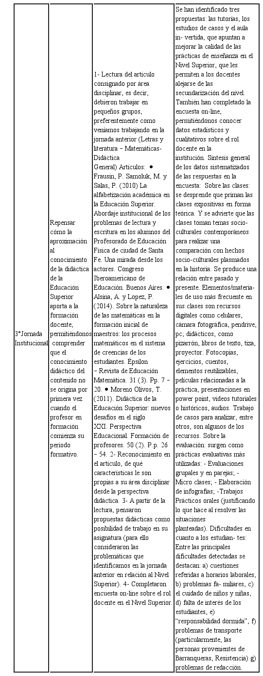 Estos dos ejemplos mencionados hasta el momento se desarrollan en el contexto de la Educación Media y recuperan las voces de los docentes involucrados en las jornadas institucionales para poder reflexionar sobre sus prácticas de enseñanza. Sin embargo, poco se ha encontrado sobre la cuestión de las jornadas institucionales en la Educación Superior, en términos del análisis didáctico que venimos mencionando, que se pueden retomar de dichas jornadas.